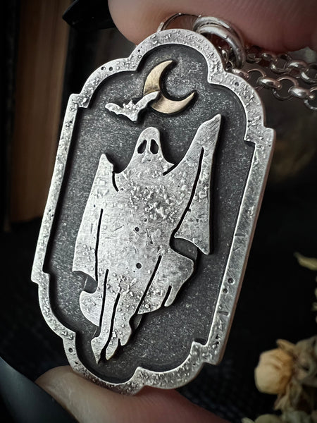Handmade sterling silver statement necklace. A hand-sawed ghost floats against a rich black sky. A petite silver bat flies in front of a brass crescent moon. The imagery sits in a hand-sawed ornate frame, complete with a beautiful matte finish and hand-texturing for an antique look. Pendant measures approximately 1 x 1.75 inches and includes a sterling silver chain in your choice of length from 16 to 30 inches.