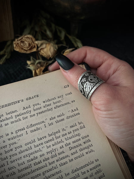 This product is made-to-order. Handmade sterling silver statement ring. A hand-sawed winged death head sits beneath hand-sawed filigree. These elements are hand-detailed and sit inside a border, accentuated with patina, to represent the common motif that decorated the headstones of many Puritan graves in New England. A gorgeous matte finish and hand-distressed detailing complete this ring. Ring is approximately 0.75 inch tall from the top of the design to the bottom.