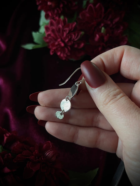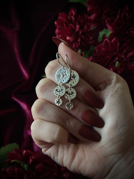 Handmade sterling silver earrings. Dangly statement earrings are decorated with hand-stamped celestial and dragon imagery. Earrings measure 0.5 x 1.25 inches and weigh less than one gram each. Earrings include a sterling silver ear hook that fit most standard ear piercings.