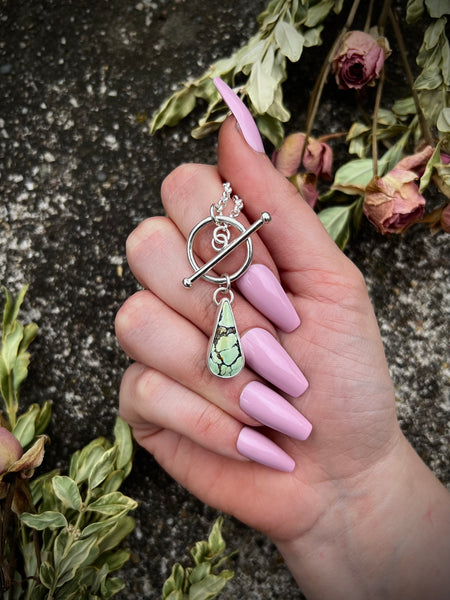 Handmade sterling silver toggle necklace. A stunning Turquoise stone is set in a simple bezel setting. Necklace includes a 16 inch sterling silver chain, complete with a sterling silver toggle clasp system. Stone measures approximately 0.375 x 0.875 inches.