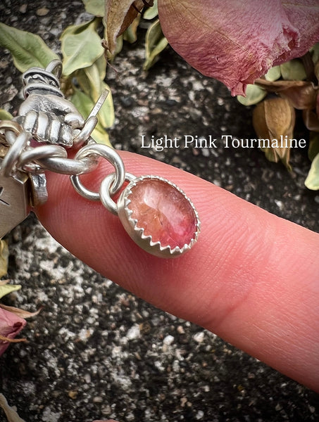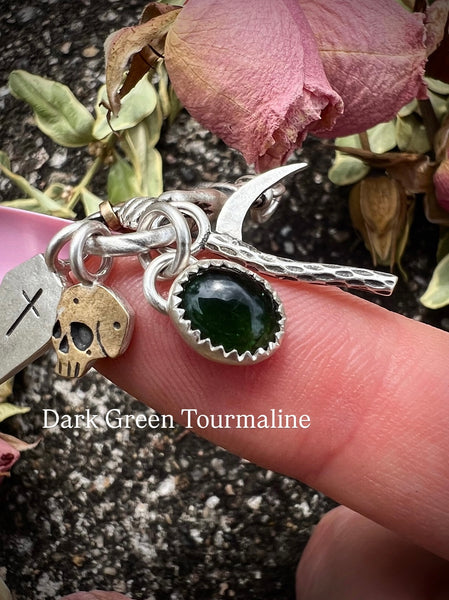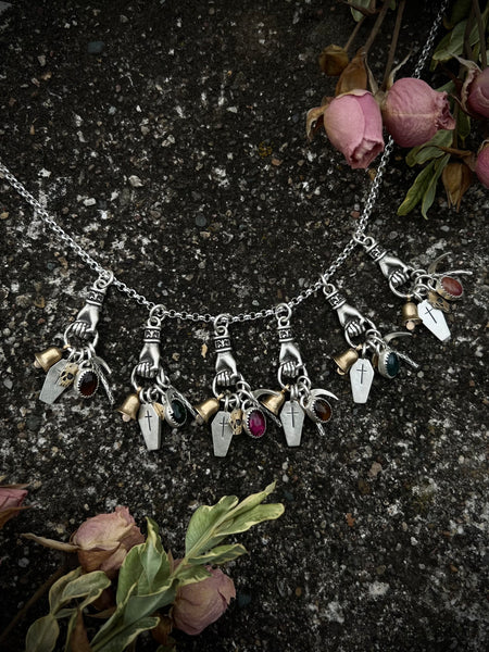 Handmade mixed metal charm necklace. A stunning sterling silver hand holds a ring of 5 charms. The charms include a vintage brass bell, a silver coffin, a brass skull (backed with sterling silver), a Tourmaline gemstone, and a silver scythe. Necklace includes a sterling silver chain in your choice of length from 16 to 30 inches.Â