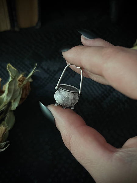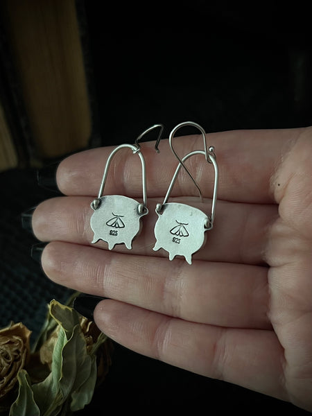 Handmade sterling silver earrings. Hand-sawed, textured cauldrons hang from sterling silver ear hooks. Hand-weathering and a matte finish complete these rustic, witchy earrings. Cauldrons measure 0.625 x 1.25 inches each and weigh about 3 grams each, approximately the same weight as a US penny.