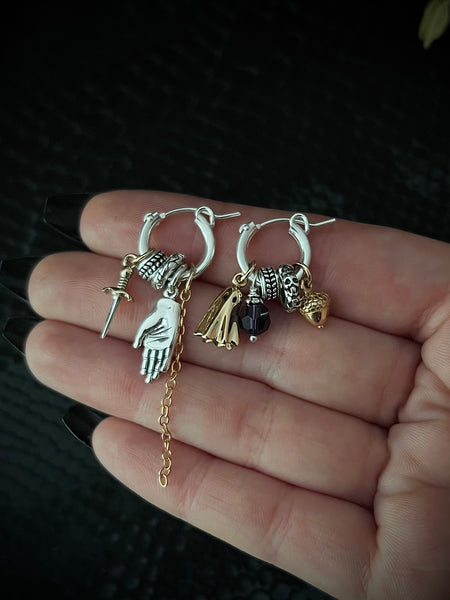 Sterling silver charm hoop earrings. These charmed hoop earrings include a pair of sterling silver hoop earrings and several bronze and silver charms. The charms you will receive with these earrings include a ghost, an acorn, a dagger, a hand, a chain, patterned jump rings for extra interest, and a crystal bead (black or dark purple). These hoop earrings have a hinged post, allowing for easy insertion and swapping/adding of your own charms. Earrings fitĀ mostĀ standard ear piercings. Hoops measure 13 mm in diameter. As they come, earrings weigh approximately 3 grams each, roughly the same weight as a US penny.