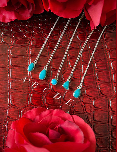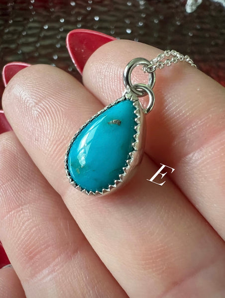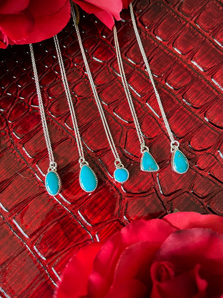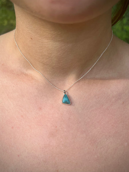 Handmade sterling silver necklace. A petite turquoise set in a serrated bezel setting dangles from a dainty sterling silver chain. The chain is adjustable up to 20 inches. Simply hold the small ball near the clasp and gently pull the chain through the ball to adjust the length of the necklace.