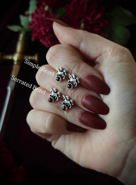 Handmade sterling silver earrings. Stunning silver unicorns leap over petite garnet stones, set in bezel settings. These earrings include sterling silver ear posts that fit most standard ear piercings. Earrings measure approximately 0.375 x 0.375 inches and weigh less than 1 gram each.